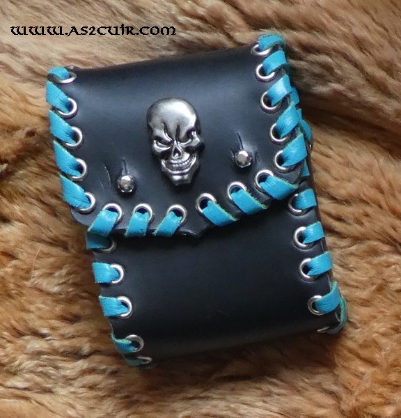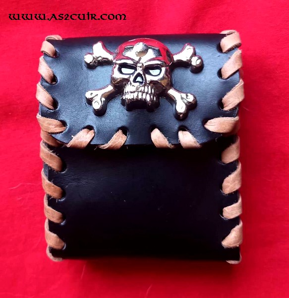 Tant pis, je m’en suis fait un !!!! Ce fourreaux, en cuir collet, 25 clopes (ou 20 + briquet, ou 20 tout court) aurait pu être orné d’un aigle, voire un dauphin, mais NON ! N’oublions pas que la cigarette tue (comme plein d’autres choses à l’heure actuelle), mais pas la pipe (sinon ils nous le diraient non ?). Son prix, tel quel, est de 55 €, mais, sans le tressage, les œillets et le motif central il ne coûterait que 30 €.